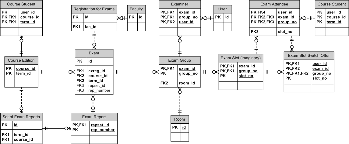 References: Faculty, Course Edition, Exam, Exam Attendee, Exam Group, Exam Report, Exam Report Set, Exam Slot (imaginary), Examiner, Registration for Exams, Room, User.